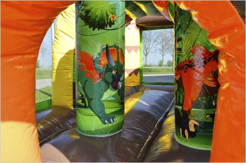 Im Inneren der Hüpfburg befinden sich diverse Hindernisse, auf denen die Kinder spielen und springen können, zudem verfügt unsere Dinopark-Hüpfburg über eine integrierte und kinderfreundlichen Rutsche.